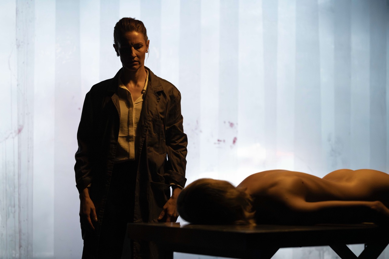 En kvinne trer inn i et likhus. Foran henne ligger en livløs kropp. Hun undersøker den. I etasjen over skrattes det med lystige mannsstemmer. Så rykker det i en arm. Den døde våkner, og dansen er i gang.